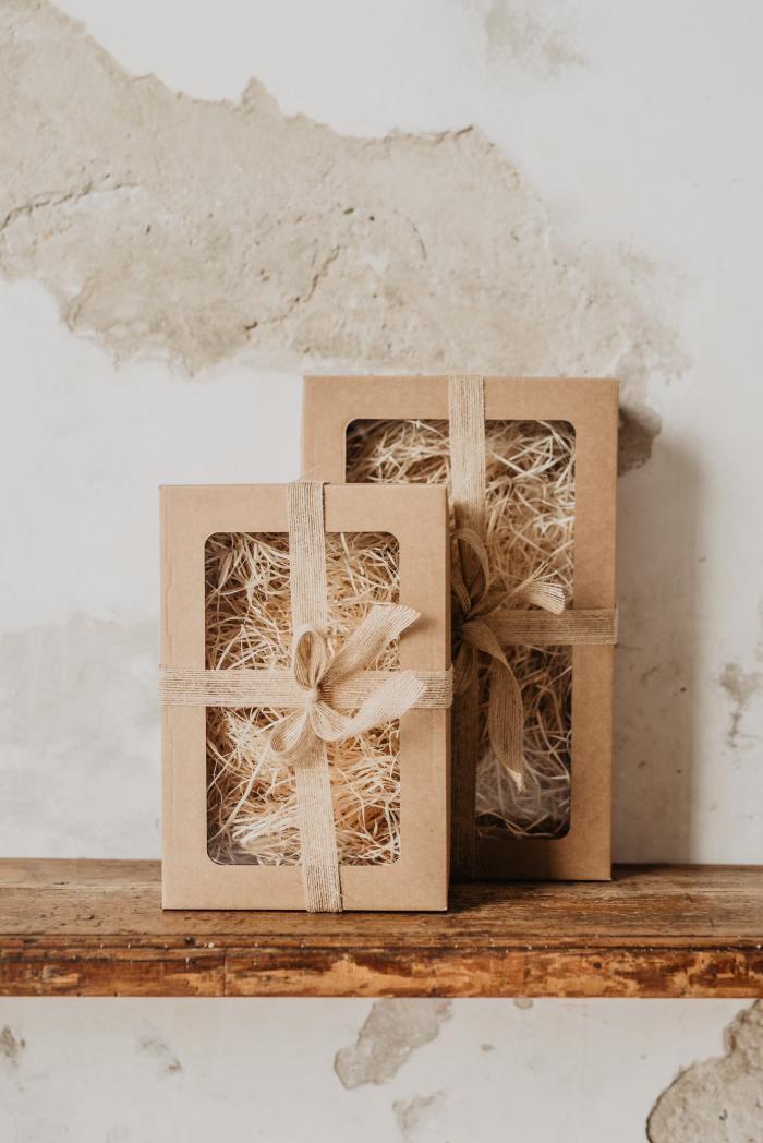 Ajándék doboz, töltő anyag, szalag.